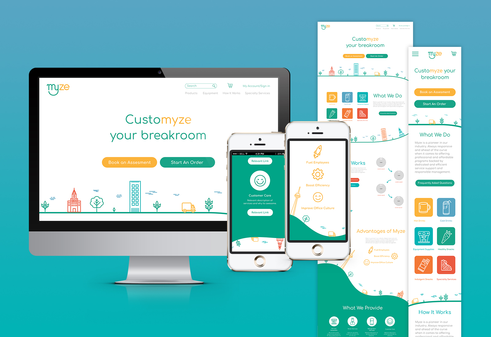 Myze provides coffee and grocery services to offices in the Toronto and GTA area. Their old brand Competition Coffee focuses only on the coffee services that are provided, and the client approached the agency to do a new website encompassing the grocery side of the service as well. We recommended a new brand and name that would also lend itself more to the services they provide before proceeding with a new website in order to ensure that the brand would be set apart from competitors offering the same services.